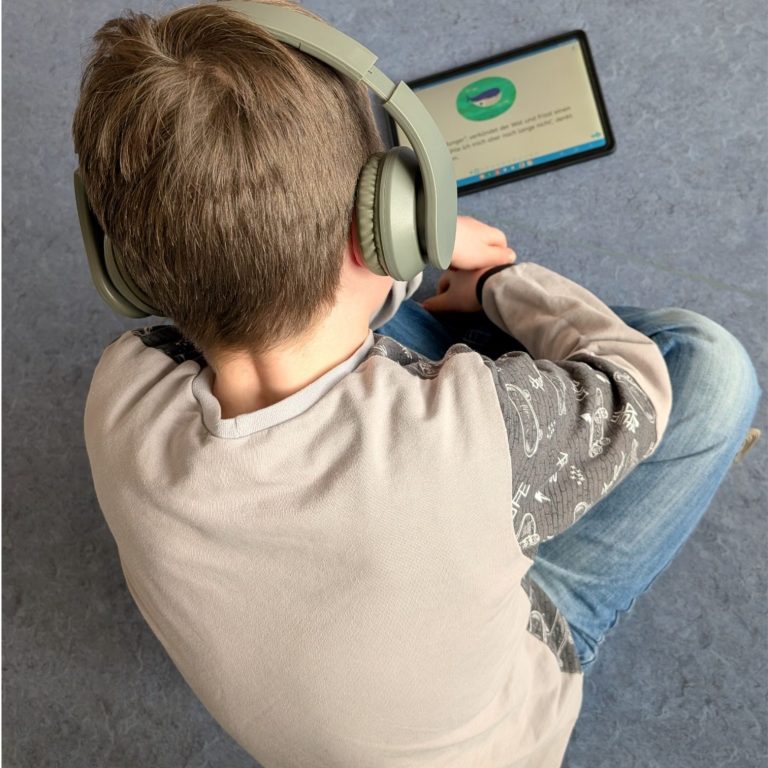 Mit Tablets tauchen sie in die eKidz-App ein. Jedes Kind arbeitet an Texten und Aufgaben, die genau zum eigenen Leseniveau passen. Durch Quiz und Aufnahmefunktion wird der Lesefortschritt spielerisch sichtbar.