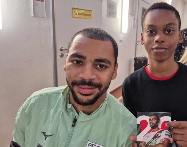Alexis Claude-Maurice war in die Aula der Schule gekommen, um Fragen der Kinder zu beantworten und den Erstklässlern zur Begrüßung Turnbeutel mit dem FCA-Emblem zu überreichen und Autogramme zu geben. Jim, ein Schüler aus der 4.Klasse, dolmetschte beeindruckend für Claude -Maurice aus dem Französischen.