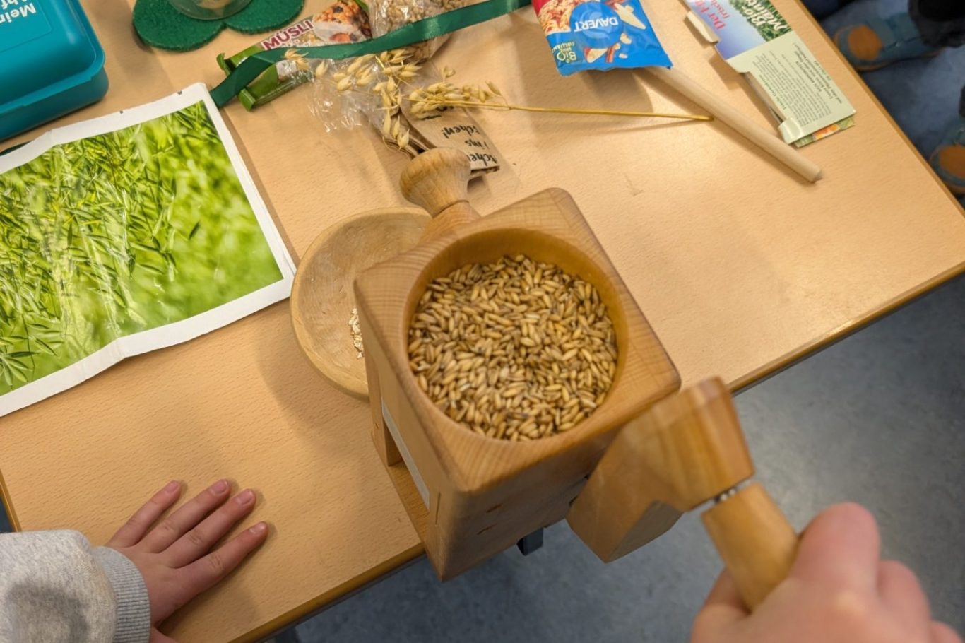 Die Kinder der 1. Klassen durften selbst Haferflocken herstellen.